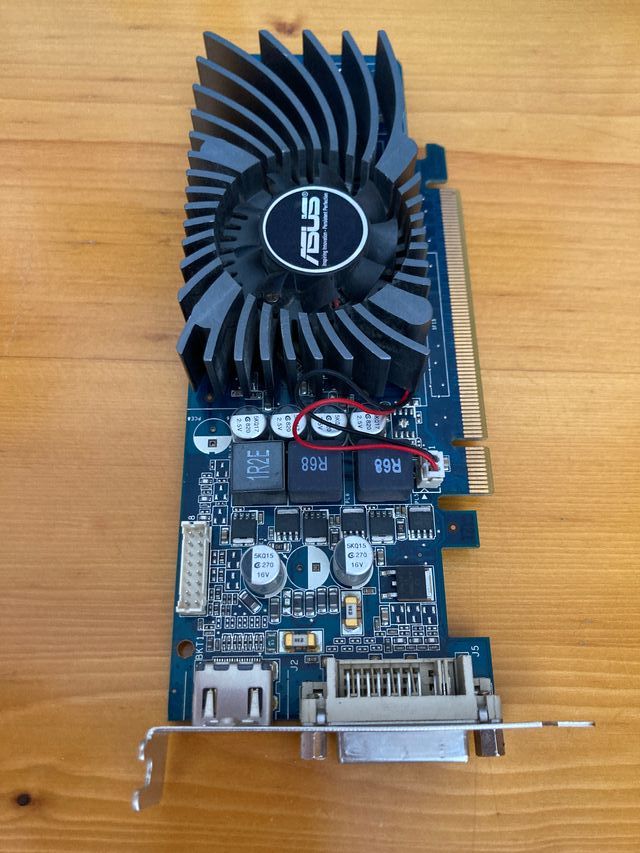 Detalles del productoSOLO ENVIO POR WALLAPOP, NO TRATO EN MANO. Tarjeta de video Asus GT 220 de 1Gb en buen estado. Salida HDMI y DVI. Limpia con pasta termica nueva. Es una tarjeta grafica compacta ideal para equipos con espacio reducido. Compatible por ejemplo con Hp Proliant MicroServer Gen8.