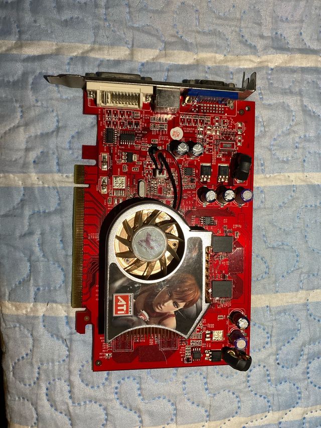 Tarjeta gráfica ATI X550 XT con ventilador. - Placa de circuito rojo. - Conector de video VGA y DVI. - Ventilador plateado con logo. - Diseño con imagen frontal.