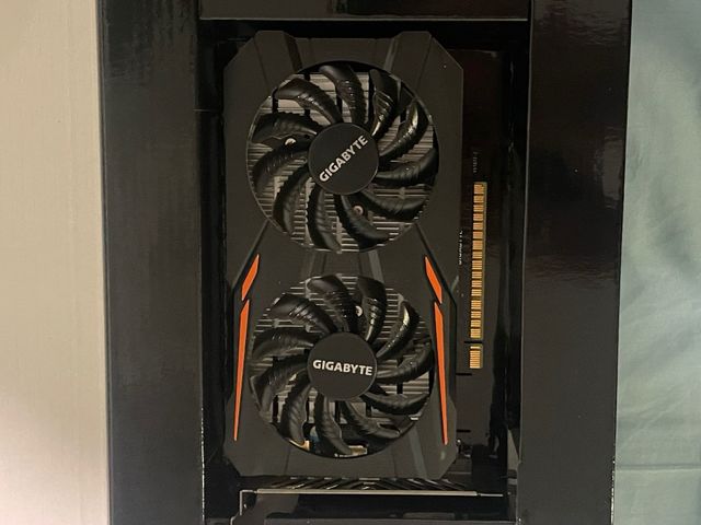 Tarjeta gráfica Gigabyte con dos ventiladores. - Diseño en negro con detalles naranjas. - Doble ventilador para refrigeración.