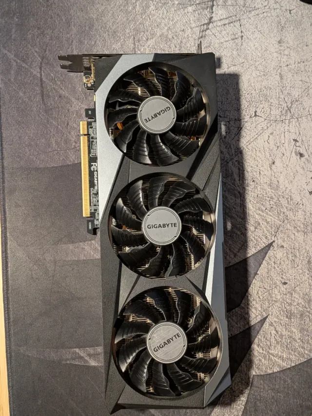 Detalles del productoTarjeta gráfica Gigabyte con un diseño de triple ventilador para una refrigeración eficiente.