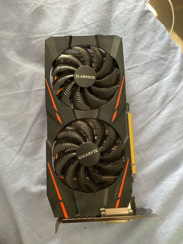 Tarjeta gráfica Gigabyte con doble ventilador. -GV-RX570GAMING-8GD-MI - Diseño con detalles en naranja. - Ventiladores con logo de Gigabyte.