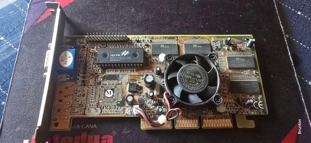 Detalles del productoTarjeta gráfica usada Holtek AM64E1-32MB con interfaz AGP. Se ve en buen estado, aunque algo polvorienta.