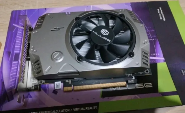 Tarjeta gráfica MLLSE con un diseño plateado y ventilador negro. - Ventilador de refrigeración. - Conexión PCI-e.