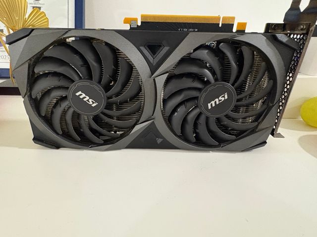 Tarjeta gráfica MSI con un diseño moderno y dos ventiladores para una óptima refrigeración. - Doble ventilador. - Diseño angular en color gris y negro.