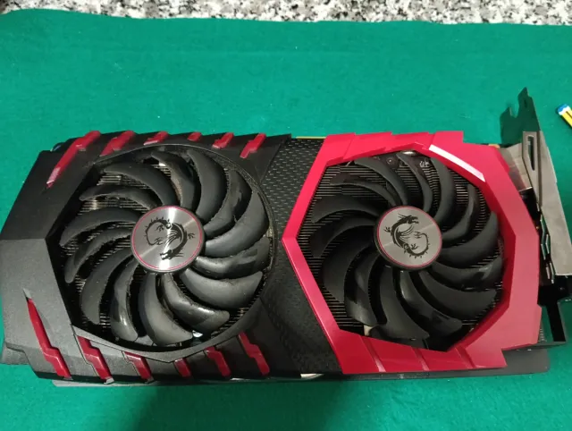 Tarjeta gráfica MSI con un diseño llamativo en negro y rojo. - Doble ventilador para una refrigeración eficiente. - Logos de dragón MSI en los ventiladores.
