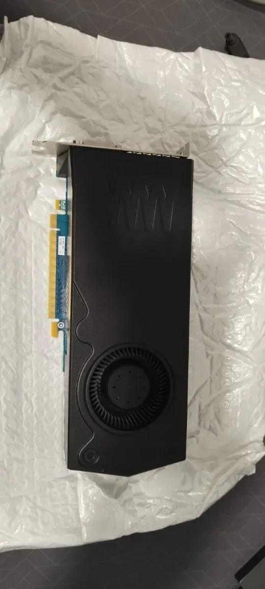 Tarjeta gráfica de color negro con un ventilador circular. - Diseño elegante y moderno. - Conexión de alta velocidad.
