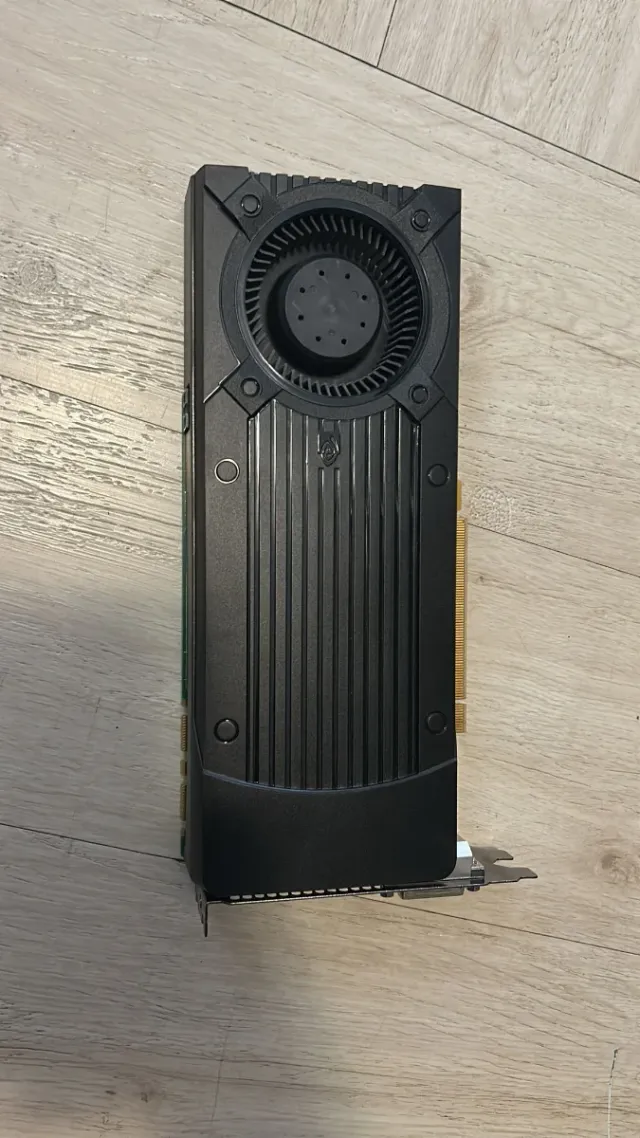 Detalles del productoTarjeta gráfica de color negro con un diseño robusto y ventilador integrado.