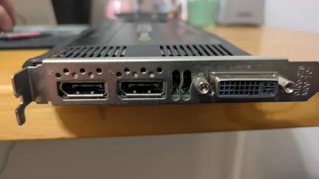 Tarjeta gráfica NVIDIA con múltiples puertos de conexión. - Dos puertos HDMI. - Un puerto DVI.