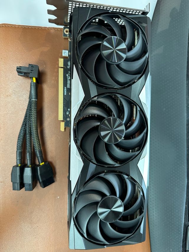 Tarjeta gráfica NVIDIA RTX 4080 con un diseño de triple ventilador. - Refrigeración eficiente. - Conectores de alimentación negros.