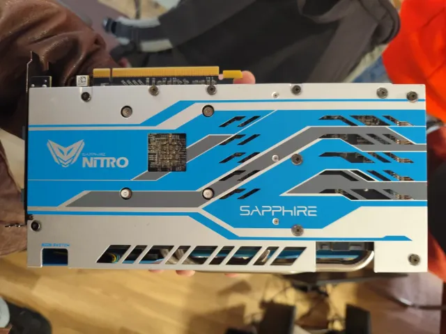 Tarjeta gráfica Sapphire con un diseño llamativo en azul y plateado. - Cubierta trasera con detalles gráficos. - Logo de Sapphire Nitro visible.