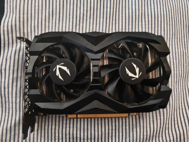 Detalles del productoTarjeta gráfica Zotac con diseño moderno y dos ventiladores para una refrigeración eficiente.