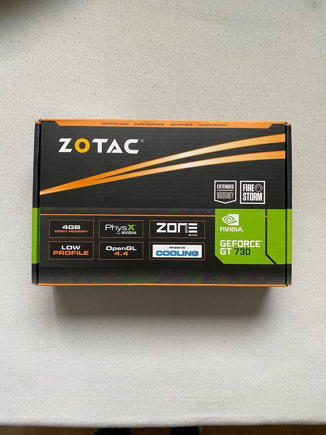 Detalles del productoTarjeta gráfica Zotac GeForce GT 730 con 4GB de memoria DDR3.