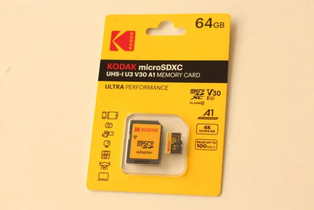 Tarjeta de memoria microSD de 64GB de Kodak, ideal para un rendimiento ultra rápido. - Capacidad: 64GB - Estado: A estrenar. - Incluye adaptador Micro SD.