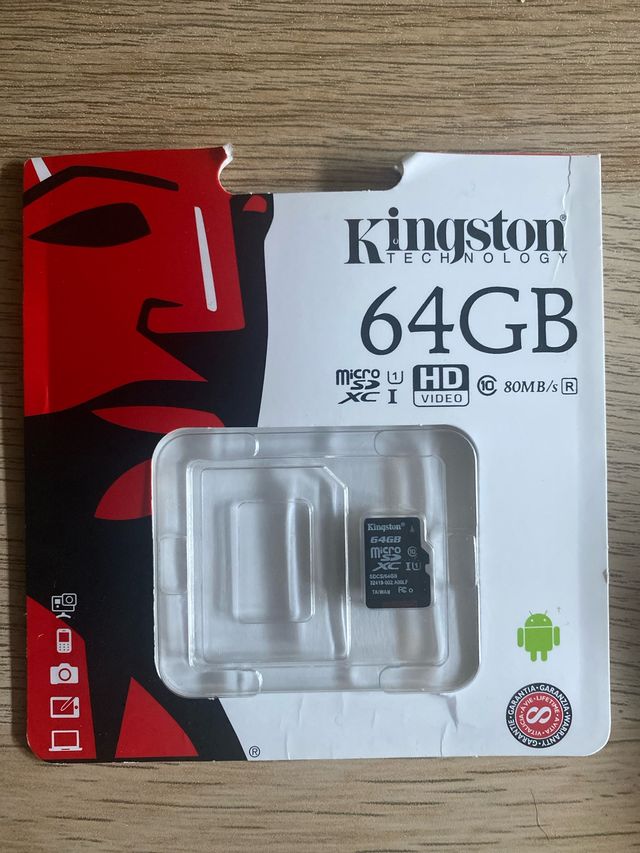 Detalles del productoTarjeta de memoria MicroSD Kingston de 64GB. Ideal para ampliar el almacenamiento de tus dispositivos.