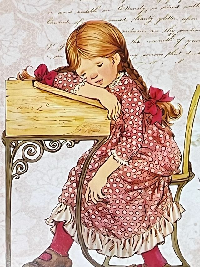 Ilustración vintage de una niña con trenzas durmiendo sobre un pupitre de madera. Lleva un vestido de lunares y lazos rojos.