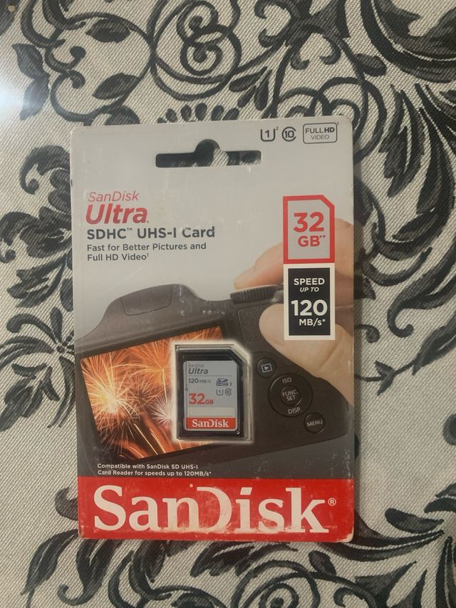 Detalles del productoTarjeta SD SanDisk Ultra de 32 GB, nueva y en su empaque original. Es una tarjeta SDHC UHS-I, ideal para fotos y videos Full HD.