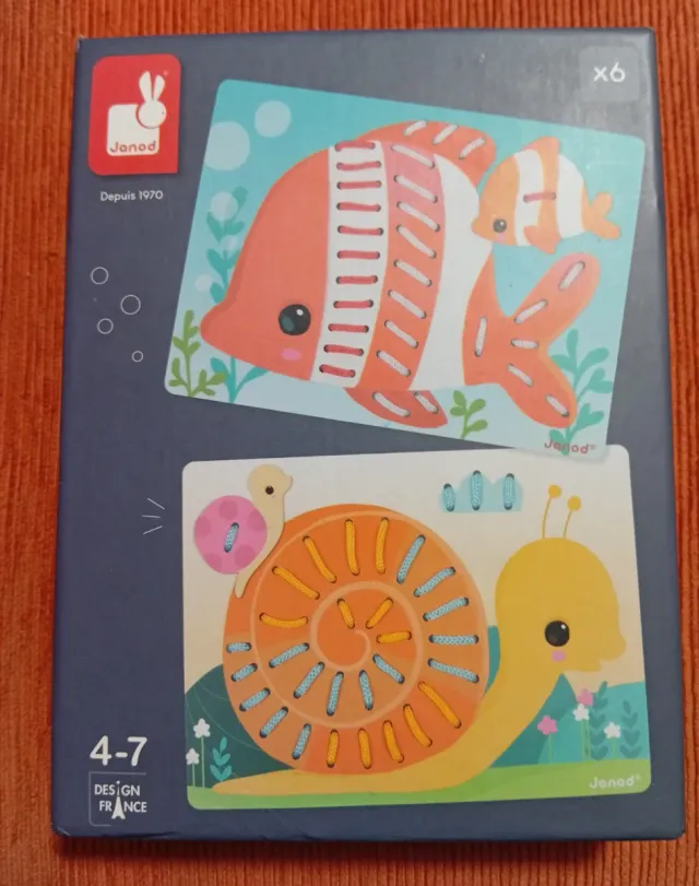 Detalles del productoJuego de tarjetas para coser de la marca Janod. Fomenta la concentración y la motricidad fina.