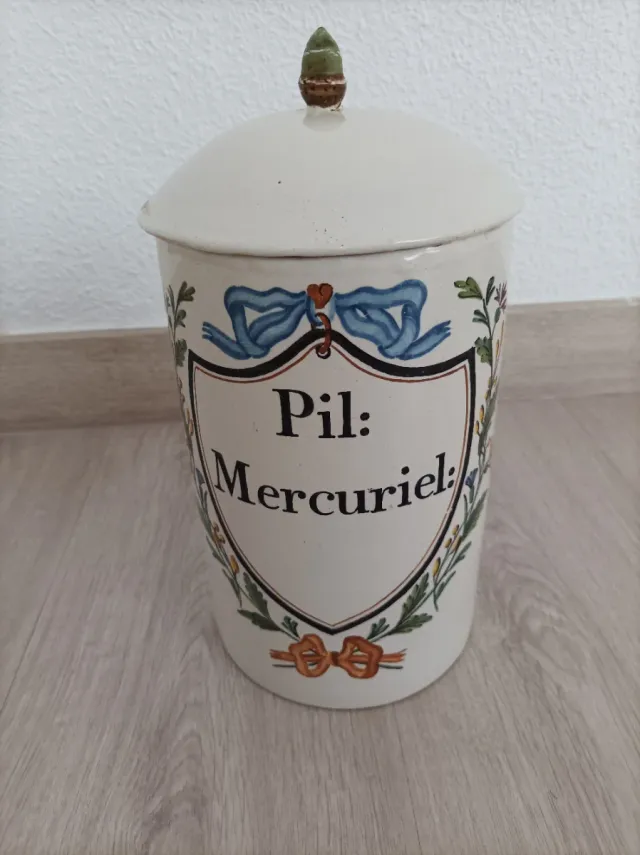 Medidas: alto con tapa 27 cm, sin tapa 22 cm y diámetro 14 cm. Pil ( píldora) y mercuriel ( mercurio).
