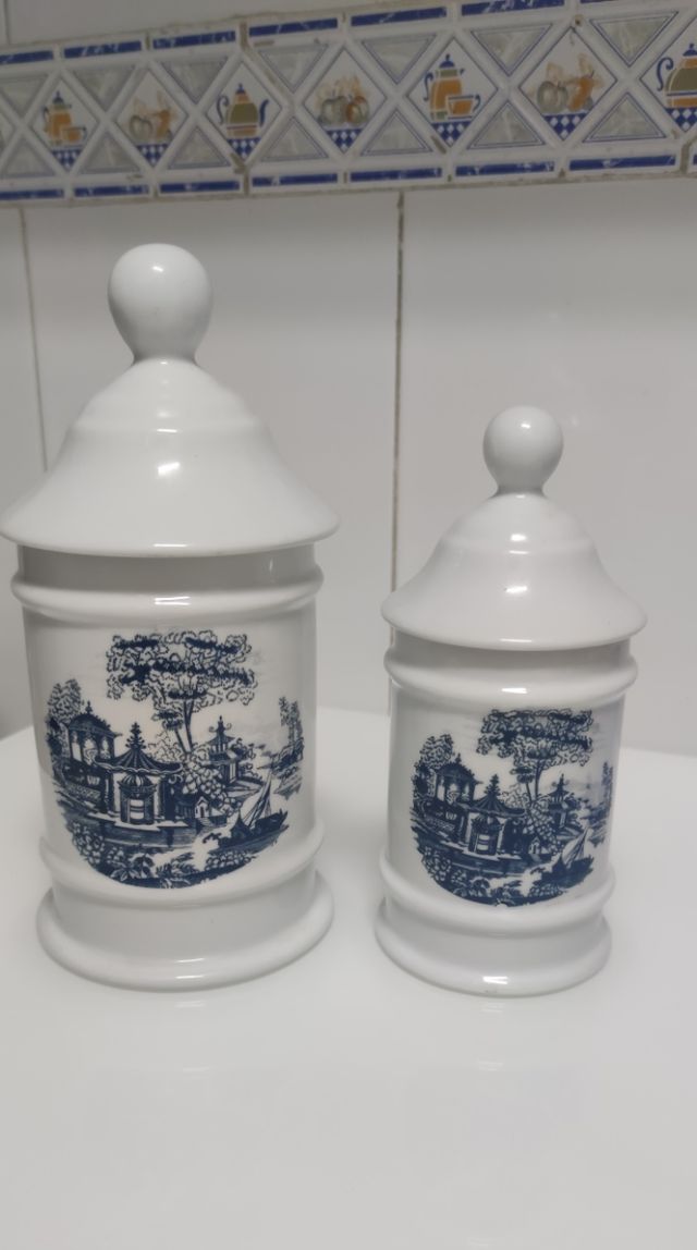 Detalles del productoPreciosos tarros de cerámica vintage, ideales para decorar o guardar pequeños objetos. Ambos presentan un diseño azul y blanco con motivos orientales.