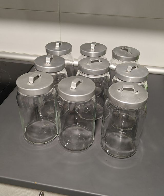 9 tarros herméticos de vidrio de Ikea. 20 alto x 10'5 ancho y largo