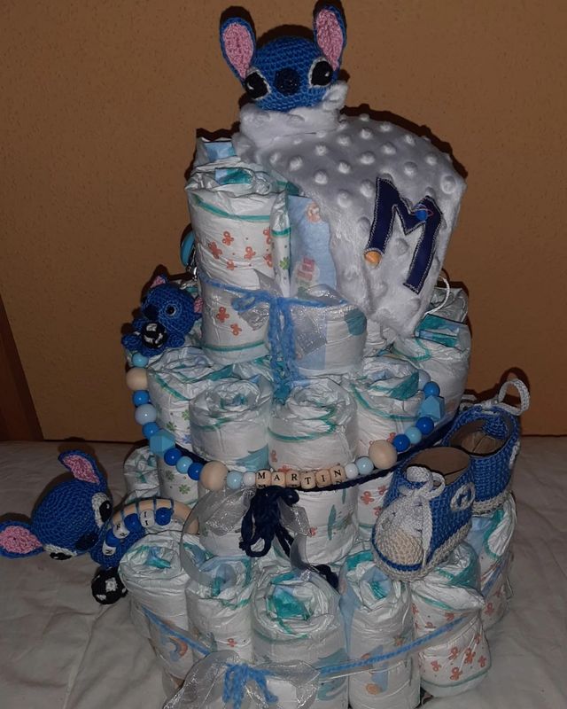 Detalles del productoPreciosas tartas de pañales hechas a mano con manta de apego, zapatillas, chupetero y sonajero de crochet.