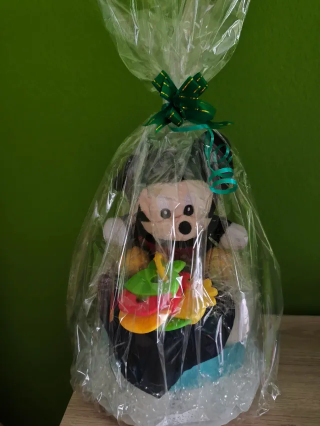 Detalles del productoOriginal tarta de pañales decorada con temática de Mickey Mouse. Un regalo único y práctico.
