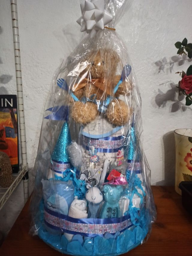Detalles del productoTarta de pañales para fiesta bienvenida, babyshowers, muy completa:54pañales Dodot sensitive talla2 , osito peluche 25cm o Mickey o Minnie,cubiertos iniciación térmicos, babero100% algodón, calcetines primavera-verano 100% algodón de 0 a tres meses,tarta bañera: neceser baño, esponja súper suave,termómetro baño,muñecos baño,peine y cepillo, sonajero, tarjeta dedicatoria, se personaliza con el nombre del bebé,con lazo y envuelto en celofán, entrega en mano, preguntar sin compromiso( la tarta de la foto se completará con el nombre del bebé y un lazo azul)