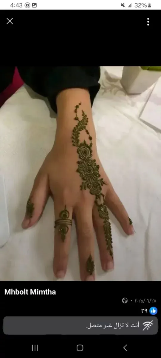 Diseño de tatuaje temporal de henna para la mano. - Aplicación detallada con motivos florales. - Tono verde oscuro.