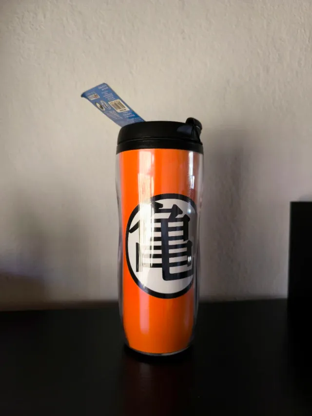 Vaso de viaje con diseño de Dragon Ball Z, todavía con la etiqueta. Nunca usado. - Color naranja vibrante. - Símbolo icónico de Dragon Ball. - Tapa negra con cierre.
