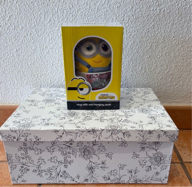Set de taza y peluche de los Minions. - Taza con diseño de Minion. - Peluche colgante de Minion.