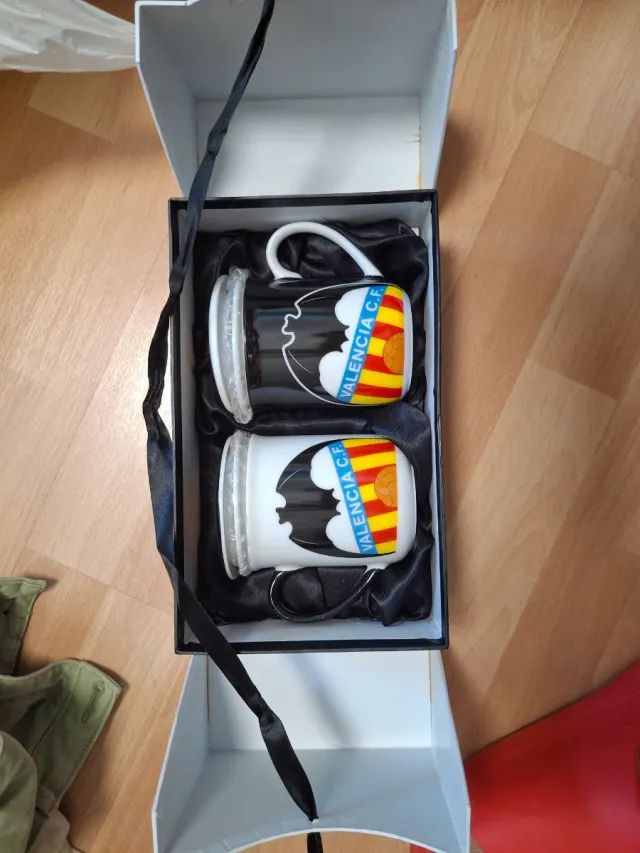 Set de dos tazas con diseño del Valencia C.F. - Tazas con tapa. - Diseño del escudo del Valencia C.F. con los colores del club. - Incluye caja de presentación.