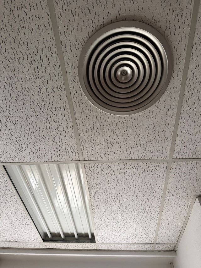 Elementos de techo para oficina, incluyendo rejilla circular de ventilación y luminaria. Aproximadamente 80 metros cuadrados