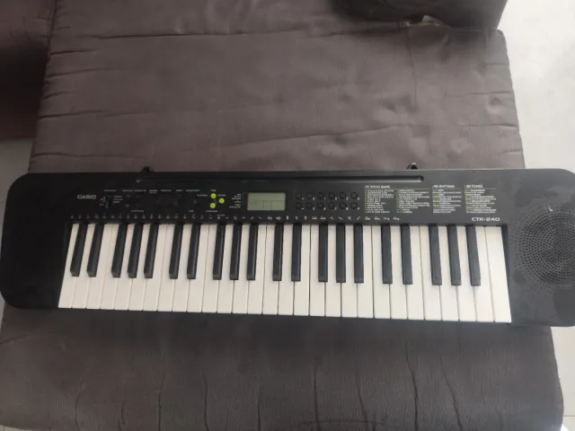 Teclado electrónico Casio CTK-240 en color negro. - 49 teclas estándar. - 100 tonos. - 100 ritmos. - 50 canciones de demostración. Funciona mediante pilas. No trae soporte.
