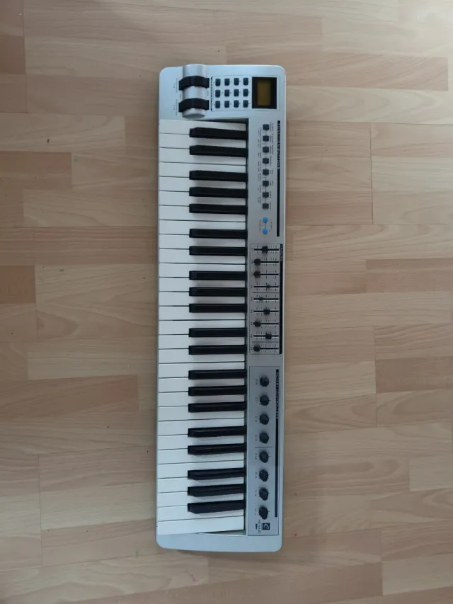 Teclado controlador MIDI de 49 teclas. - Diseño compacto y portátil. - Controles asignables para producción musical. - Pantalla LCD integrada.