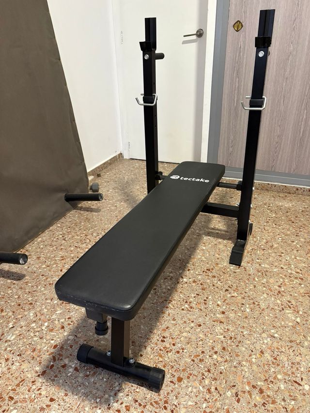 Banco de pesas Tectake con soporte para entrenamiento. - Estructura metálica negra. - Banco acolchado. - Soportes ajustables. en perfecto estado.
