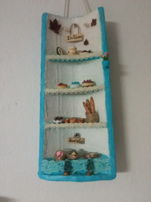 - Diseño de estantería con miniaturas de dulces y panes todas echas a mano.