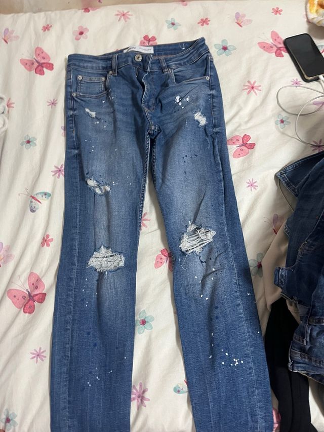 Pantalones vaqueros de corte ajustado con un diseño moderno y desgastado.