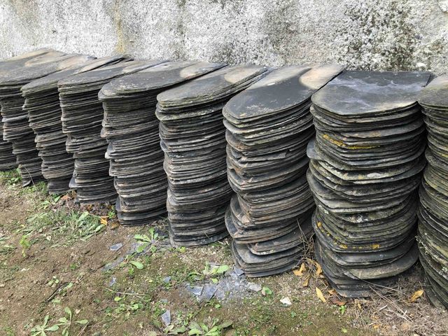 Detalles del productoRestos de tejas de pizarra para tejado. Precio de regalo. Quedan algunas con tara de punta pico pala, algunas cuadradas, otras rotas, otras que son medias piezas...