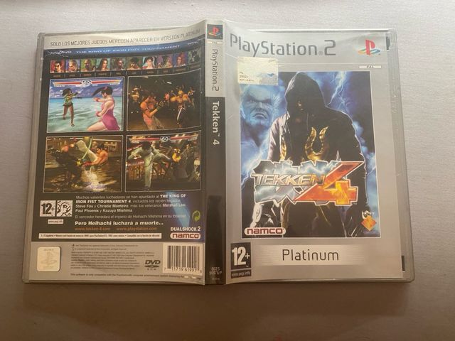 caratula y caja de Tekken 4 para PlayStation 2 en su edición Platinum. la caja tiene la pestaña rota y la pegatina de la portada dañada