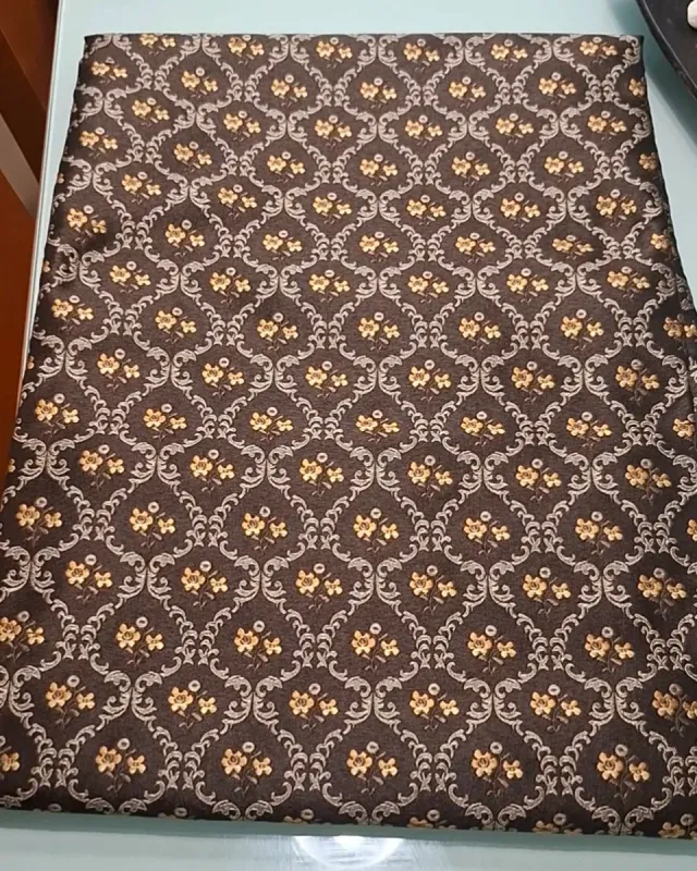 Corte de tela con un bonito estampado floral en tonos marrones y un tono beige/mostaza suave.