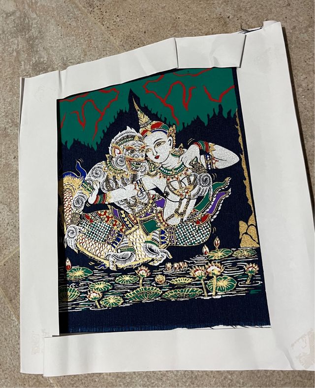 Auténtica tela artesanal de Bali, con un diseño vibrante y detallado.