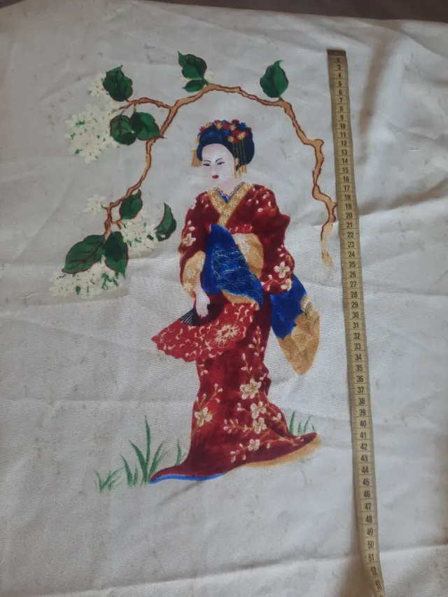 Tela de diseño, inspirada en motivos orientales, presentando una geisha con kimono y flores. Fondo amarillo