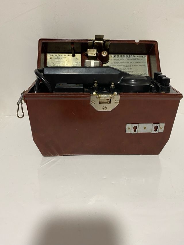 Detalles del productoTeléfono de campaña militar tipo TC-72 años 50/60, la caja es de baquelita al igual q el tlf. Las instrucciones están en la misma tapa y una manivela en un lateral Medidas del producto