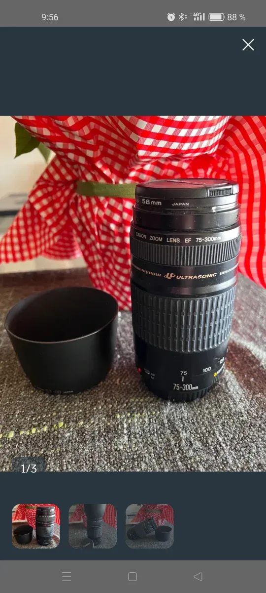 Detalles del productoTeleobjetivo Canon EF 75-300mm f/4-5.6 con parasol.