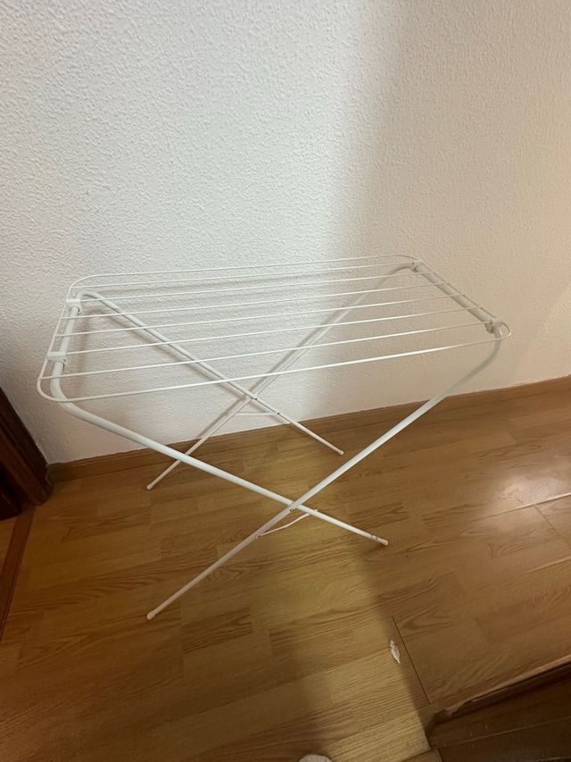 Detalles del productoTendedero plegable de color blanco, ideal para secar la ropa en interiores o exteriores.