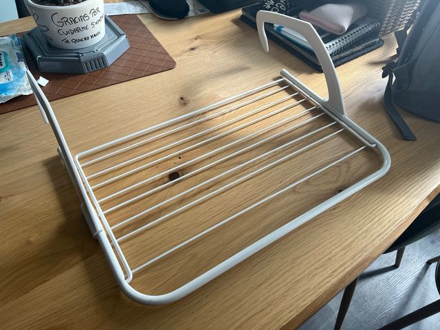 Tendedero plegable de color blanco, ideal para espacios reducidos. - Estructura de metal. - Diseño compacto y funcional. medidas en la foto nunca se usó