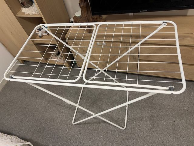 Detalles del productoTendedero plegable de color blanco, ideal para secar la ropa en casa. Es fácil de guardar y ocupa poco espacio.