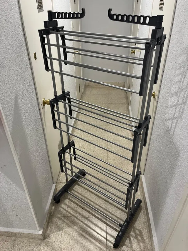 Detalles del productoTendedero Plegable para Ropa con Ruedas Tendedero Vertical de Acero Tipo Torre de 3 Niveles con Alas Plegables y Colgadores Giratorios Carga 70 kg 73x64x177 cm Medidas del producto