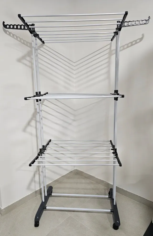 Detalles del productoTendedero vertical de tres niveles con ruedas para facilitar su movilidad. Ideal para optimizar el espacio de secado.
