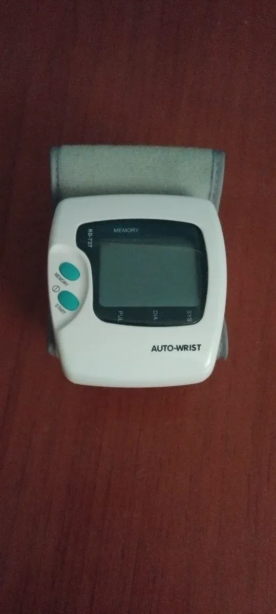 Tensiometro digital de muñeca para medir la presión arterial. - Modelo KD-737. - Pantalla LCD. - Botones de memoria y inicio. - Indicadores de pulso, presión sistólica y diastólica.